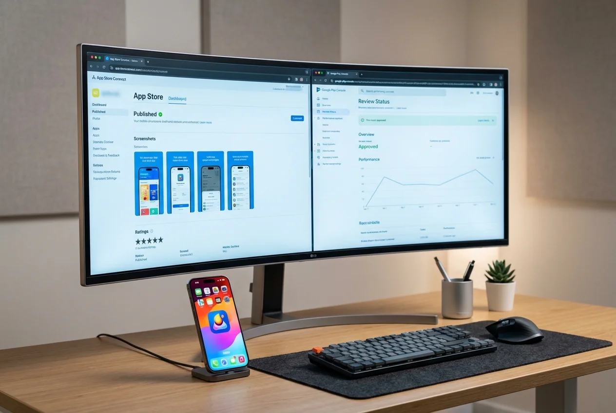 הגשה ל-App Store ו-Google Play, ניהול Review Process, Launch Strategy ומעקב KPIs.